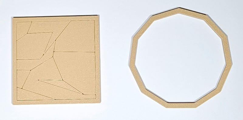 Along with the dissection puzzle pieces, I've also created frames to make assembly easier. I'll mention some other use cases later, but I'll present these as they were originally intended: a puzzle and its two frames, with each puzzle color-coded so that I can store them all in one bin.